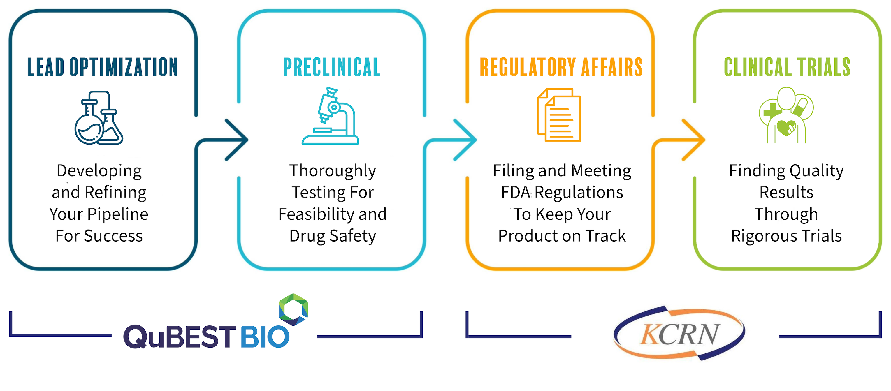 Working together as one organization, QuBEST BIO and KCRN Research are a Global Full-Service CRO that services, manages, and consults on each step of your drug development pipeline with the quality support you need tailored to your study needs.